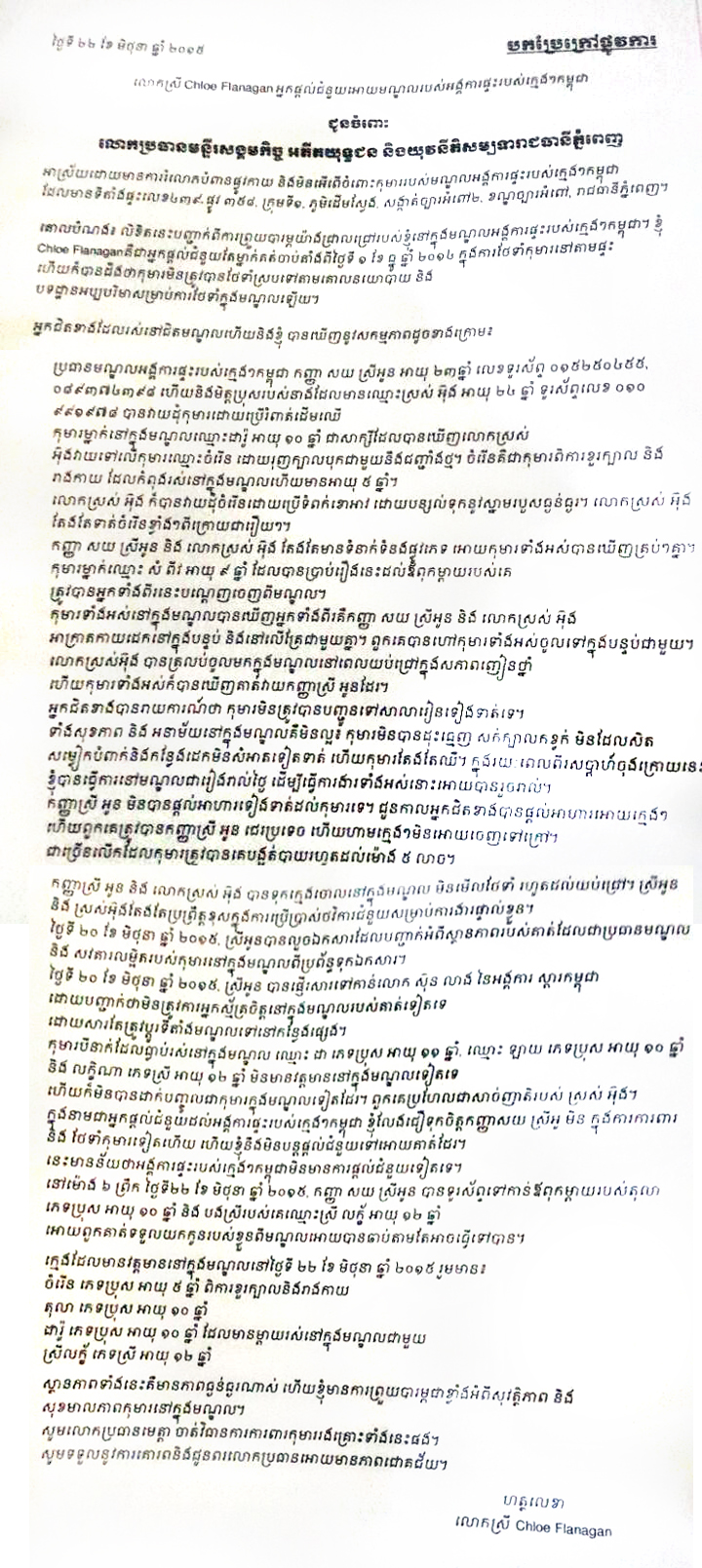 គោលបំណង៖ លិខិតនេះបញ្ជាក់ពីការព្រួយបារម្ភយ៉ាងជ្រាលជ្រៅរបស់ខ្ញុំ នៅក្នុងមណ្ឌលអង្គការផ្ទះរបស់ក្មេងៗកម្ពុជា។ ខ្ញុំ Chloe Flanagan គឺជាអ្នកផ្តល់ជំនួយតែម្នាក់គត់ ចាប់តាំងពីថ្ងៃទី១ ខែធ្នូ ឆ្នាំ២០១៤ ក្នុងការថែទាំកុមារនៅតាមផ្ទះ ហើយក៏បានដឹងថា កុមារមិនត្រូវបានថែទាំ ស្របទៅតាមគោលនយោបាយ និងបទដ្ឋានអប្បបរិមាសម្រាប់ការថែទាំក្នុងមណ្ឌលឡើយ។