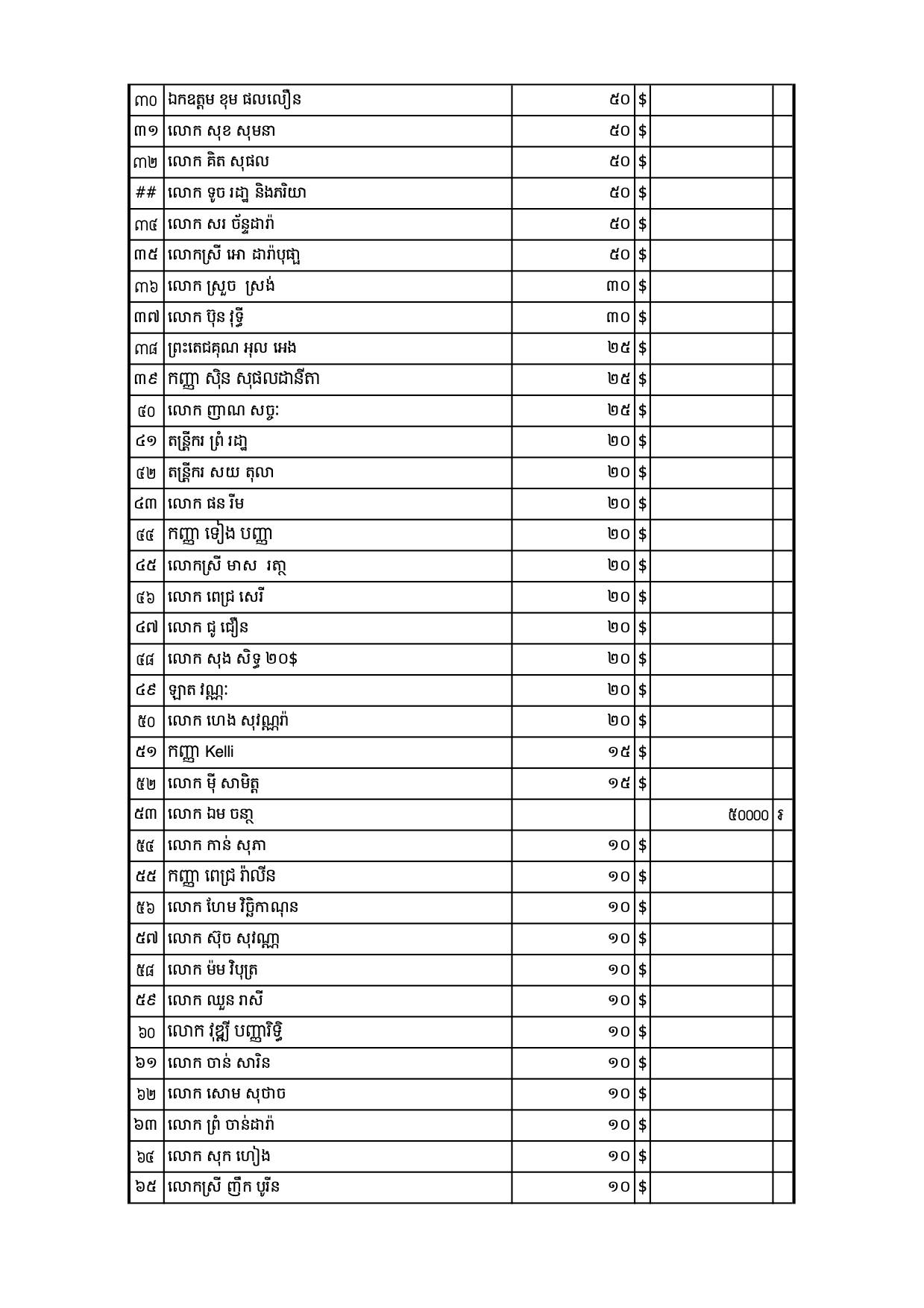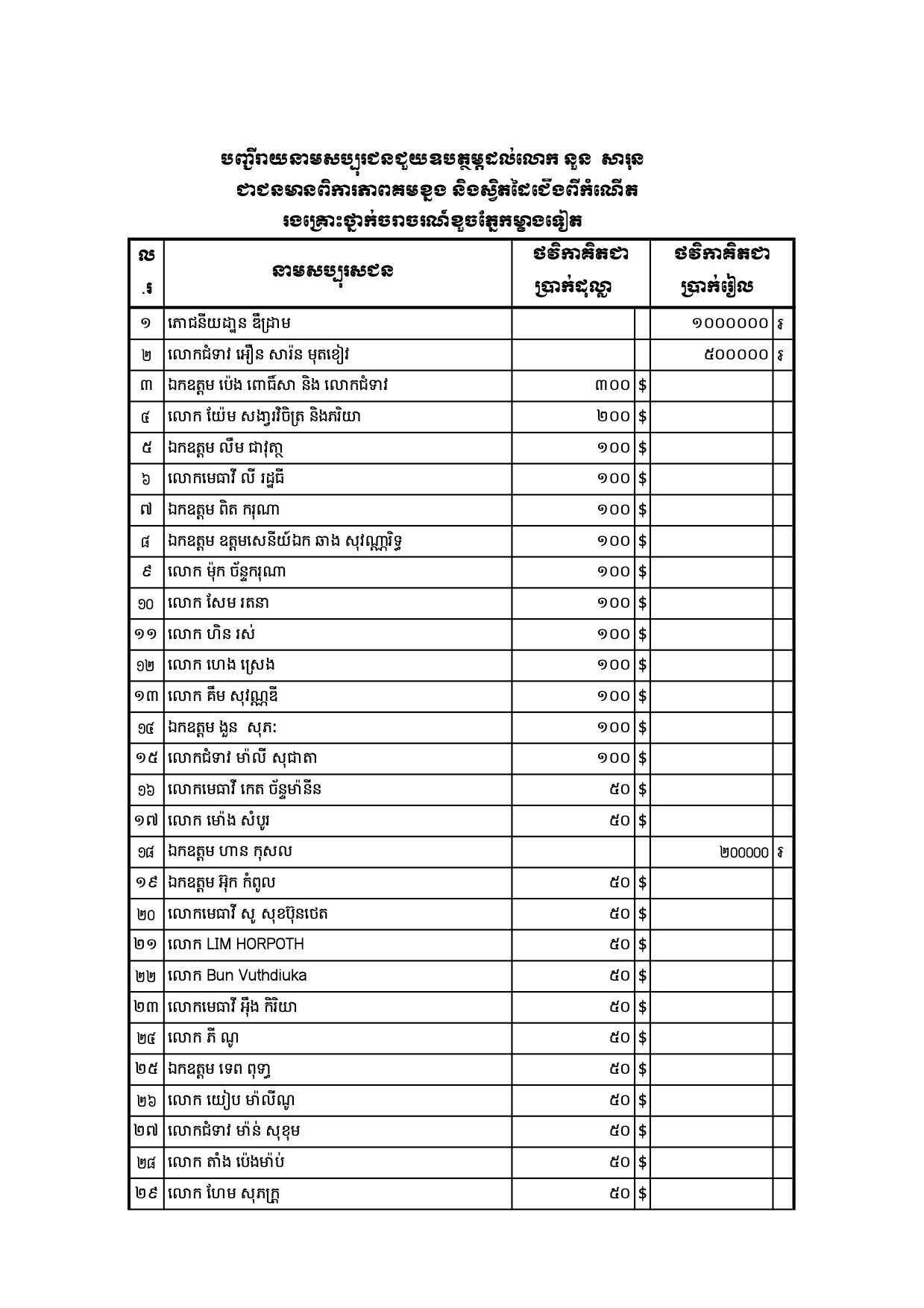 ខាងក្រោមនេះគឺជាបញ្ជីរាយនាមសប្បុរសជនដែលបានជួយឧបត្ថម្ភដល់ជនពិការគមខ្នងលោក នួន សារុន តាមរយៈឯកឧត្តម ឯម ច័ន្ទមករា៖