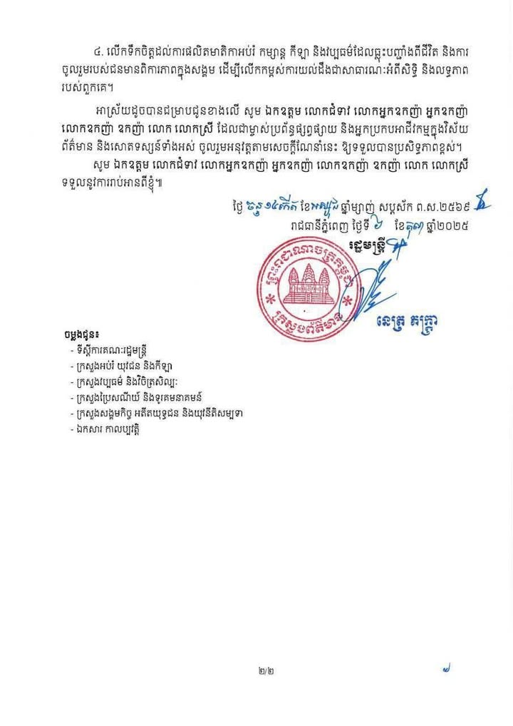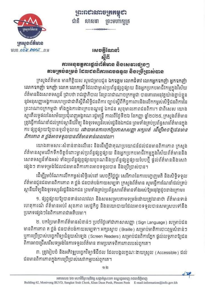 ក្នុងនាមអង្គភាពជំនាញ អគ្គលេខាធិការដ្ឋានក្រុមប្រឹក្សាសកម្មភាពជនពិការ និងក្នុងនាមជនមានពិការភាពគ្រប់ប្រភេទ សូមថ្លែងអំណរគុណដ៏ជ្រាលជ្រៅបំផុតជូនចំពោះឯកឧត្តមរដ្ឋមន្រ្តីក្រសួងព័ត៌មាន ដែលបានអនុវត្តអនុសាសន៍របស់សម្តេចមហាបវរធិបតី ហ៊ុន ម៉ាណែត នាយករដ្ឋមន្រ្តីនិងជាប្រធានកិត្តិយសក្រុមប្រឹក្សាសកម្មភាពជនពិការ នាឱកាសកិច្ចប្រជុំពេញអង្គគណ:រដ្ឋមន្រ្តីក្នុងរបៀបវារ:ទី៦ការអនុម័តរបាយការណ៍ដំបូងស្តីពីការអនុវត្តអនុសញ្ញាស្តីពីសិទ្ធិជនពិការកាលពីថ្ងៃទី២៦ ខែកញ្ញា ឆ្នាំ២០២៥។ (ខ្លឹមសារអនុសាសន៍ទាំងស្រុងមាននៅខាងក្រោម)។ សូមអរគុណចំពោះឯកឧត្តមរដ្ឋមន្រ្តីដែលបានដាក់ចេញសេចក្តីជូនដំណឹងដល់នីតិបុគ្គលសាធារណ:និងឯកជនទាំងអស់ដែលបាននិងកំពុងផ្តល់សេវាព័ត៌មាន ដើម្បីឱ្យជនមានពិការភាពគ្រប់ប្រភេទជាពិសេសជនមានពិការភាពគ-ថ្លង់ និងពិការភាពភ្នែកទទួលព័ត៌មានបានដូចមនុស្សទូទៅ។ ប្រសិនបើសេចក្តីជូនដំណឹងនេះត្រូវបានអនុវត្តដោយអ្នកផ្តល់សេវាព័ត៌មានទាំងអស់ទាំងរដ្ឋនិងឯកជន នោះជនមានពិការភាពគ្រប់ប្រភេទពិតជាទទួលបានព័ត៌មានគ្រប់ៗគ្នាមិនខាន។ អនុសាសន៍ទាំងស្រុង÷ ៦- ដើម្បីជំរុញការអនុវត្តអនុសញ្ញាស្តីពីសិទ្ធិជនពិការនៅកម្ពុជា ឱ្យទទួលបានជោគជ័យនិងមានប្រសិទ្ធភាពខ្ពស់៖ ៦.១-ប្រគល់ភារកិច្ចជូនឯកឧត្តម ជា សុមេធី រដ្ឋមន្ត្រីក្រសួងសង្គមកិច្ច អតីតយុទ្ធជន និងយុវនីតិសម្បទា និងជាប្រធានក្រុមប្រឹក្សាសកម្មភាពជនពិការ ត្រូវបន្តជំរុញការអនុវត្ត ផែនការយុទ្ធសាស្ត្រជាតិស្តីពីពិការភាព ២០២៤-២០២៨ ច្បាប់ស្តីពីកិច្ចការពារនិងលើកកម្ពស់សិទ្ធិជនពិការ អនុសញ្ញាស្តីពីសិទ្ធិជនពិការ គោលនយោបាយជាតិនិងអន្តរជាតិនានា ដើម្បីជាឧត្តមប្រយោជន៍ដល់បងប្អូនជនមានពិការភាពគ្រប់ប្រភេទនិងគ្រប់កម្រិត។ ៦.២- ប្រគល់ភារកិច្ចជូនរដ្ឋមន្ត្រីគ្រប់ក្រសួង ប្រធានគ្រប់ស្ថាប័ន ព្រមទាំងអាជ្ញាធរមានសមត្ថកិច្ច គ្រប់លំដាប់ថ្នាក់ អង្គការដៃគូពាក់ព័ន្ធ និងវិស័យឯកជន ត្រូវបន្តជួយសហការគាំទ្រដល់ ក្រុមប្រឹក្សាសកម្មភាពជនពិការ ក្រសួងសង្គមកិច្ច អតីតយុទ្ធជន និងយុវនីតិសម្បទា និងមូលនិធិជនពិការ ក្នុងការបន្តពង្រឹងការអនុវត្តផែនការយុទ្ធសាស្ត្រជាតិស្តីពីការកសាងសមត្ថភាព និងការអភិវឌ្ឍធនធានមនុស្ស ស្របតាមយុទ្ធសាស្ត្របញ្ចកោណ ដំណាក់កាលទី១ ដោយផ្តល់អាទិភាពលើការបណ្តុះបណ្តាលជំនាញ ការរក្សាបានទេពកោសល្យនិងការច្នៃប្រឌិតរបស់ជនមានពិការភាព ដែលជាធនធានដ៏សំខាន់មិនអាចខ្វះបាន ស្របតាម ទិសស្លោក «មិនទុកឱ្យនរណាម្នាក់នៅដាច់ដោយឡែក»។ ៦.៣-ប្រគល់ភារកិច្ចជូនរដ្ឋមន្ត្រីគ្រប់ក្រសួង ប្រធានគ្រប់ស្ថាប័ន ត្រូវបន្តយកចិត្តទុកដាក់ក្នុង ការលើ